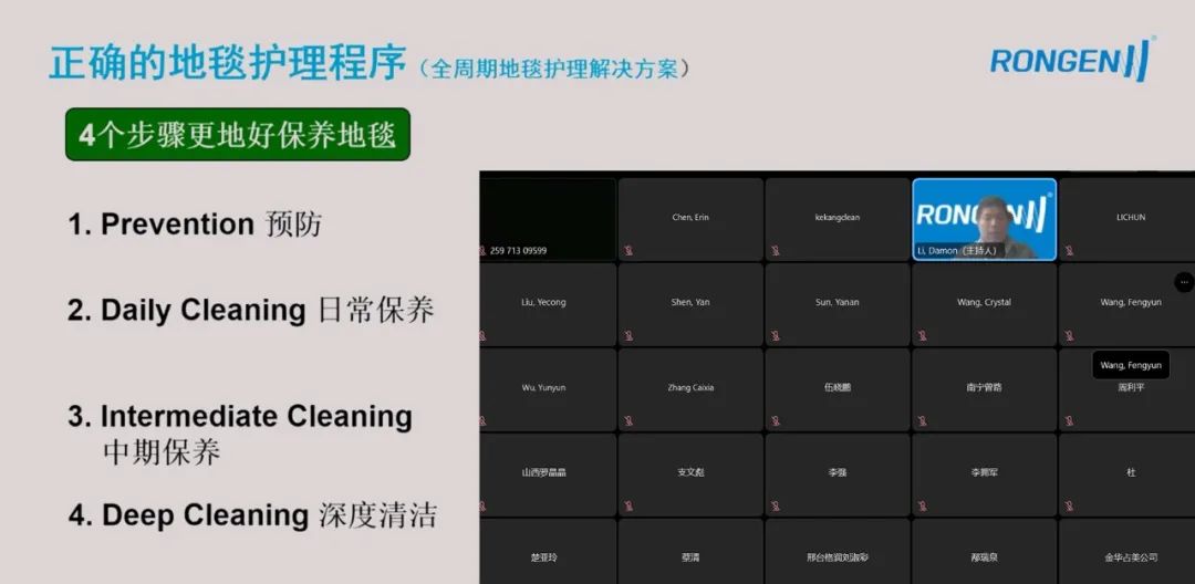 培训中,坦能集团中国市场部培训经理Damon为经销商带来了全周期的地毯护理方案,内容包括地毯收益、清洁挑战、清洁方案、产品推荐等。
