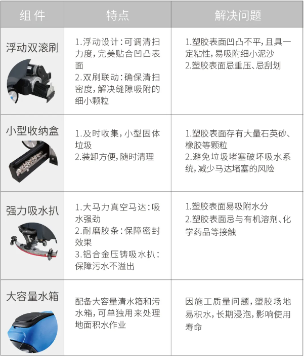杏耀塑胶跑道洗扫一体机系列,集清扫、清洗、吸干为一体,凭借四大核心组件(浮动双滚刷、小型收纳盒、强力吸水扒、大容量水箱),可针对塑胶跑道表面特性,提供有效清洁养护作业,是各类校园、体育场所、公园步道等塑胶地面的养护利器。三种机型,可根据场地面积适配型号。
