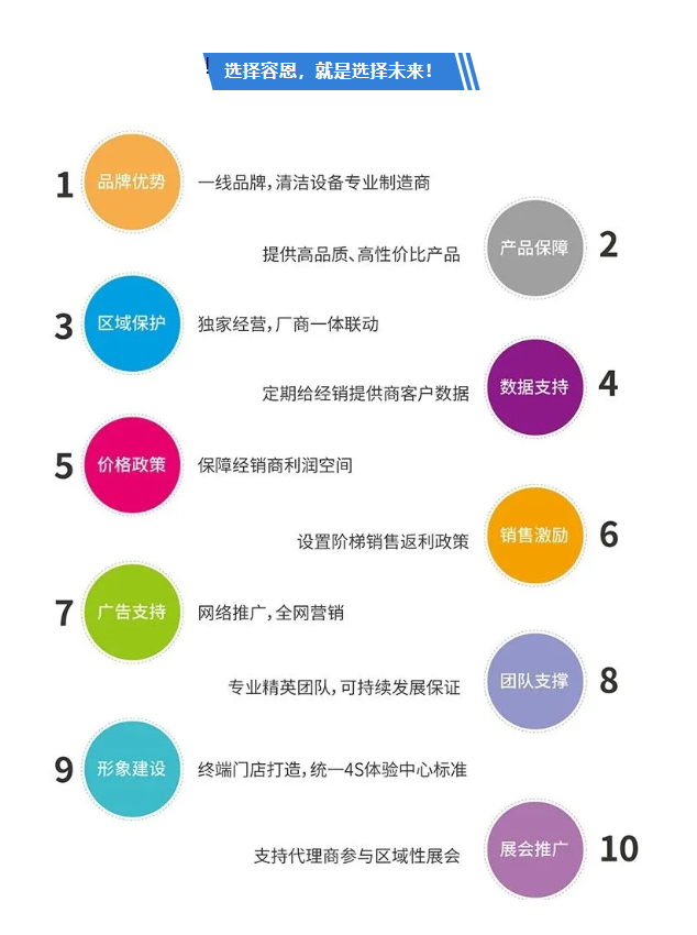 区域独家经营,支持合作伙伴打造杏耀清洁设备4s服务体验中心,统一品牌形象,打造集展示、体验、会议、培训、售后、办公等多功能的服务综合体,逐步建立全国统一、标准化、专业化的4s门店。