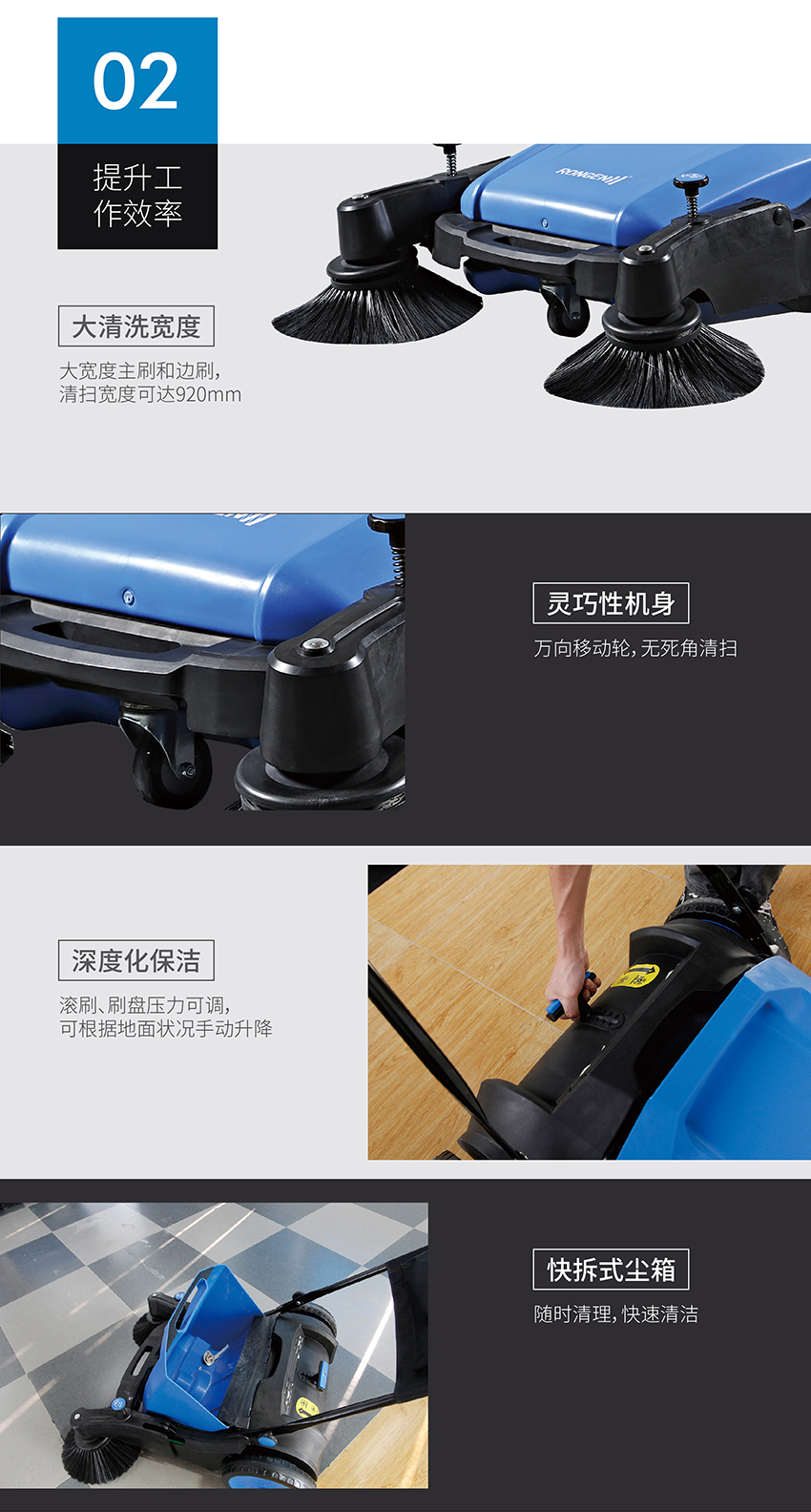 用途:环保型扫地车体现非凡设计,功效显著,手推式人工动力扫地车致力于生产世界品质的各类工商业系列清洁设备。